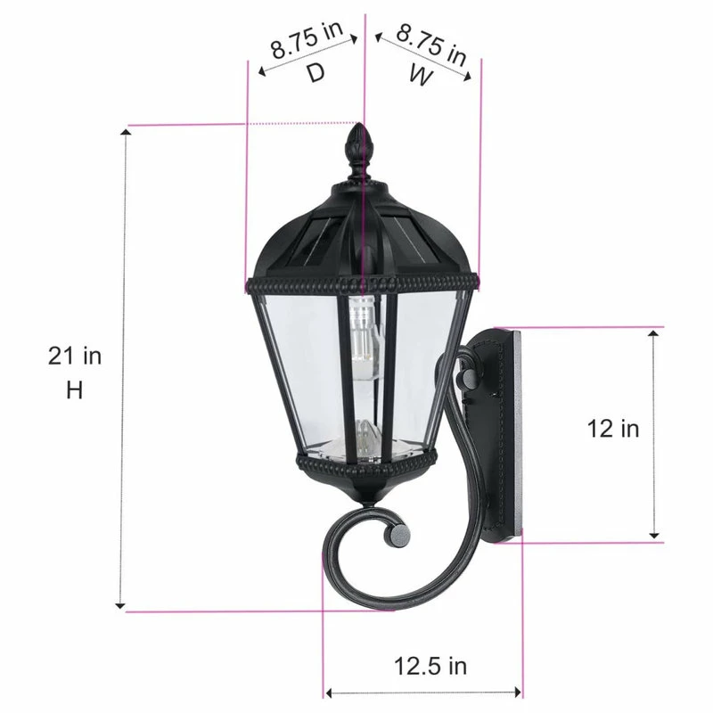 - Simple installation – no electrical wiring is required for installation, making this solar LED light The perfect light to install while offering an energy and money saving alternative to electric or gas-powered outdoor lighting. Simply Place the outdoor wall light where ample sunshine is available. Dimensions: 9 x 12. 5 x 21