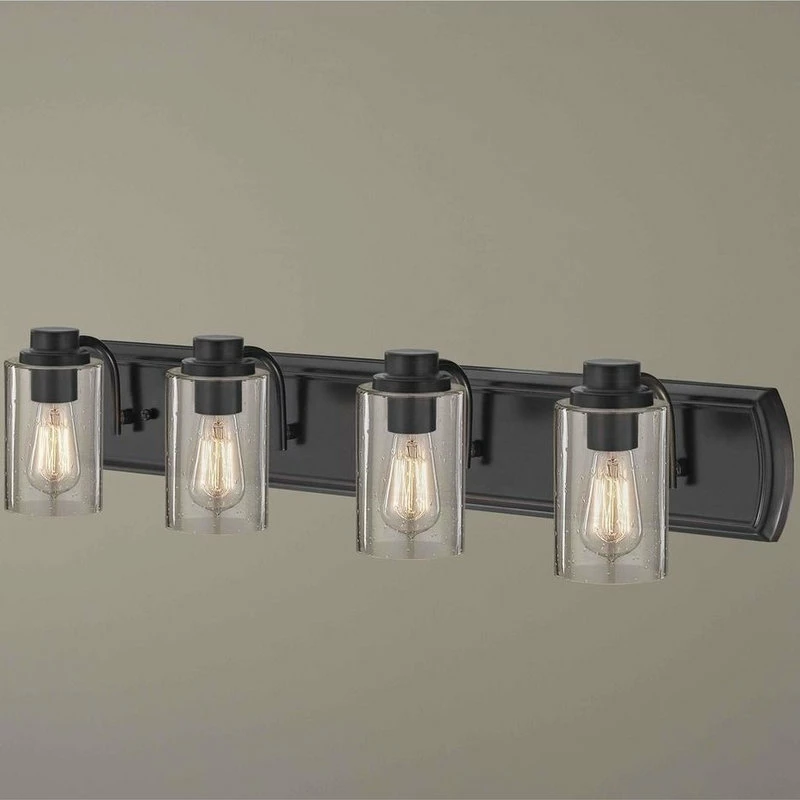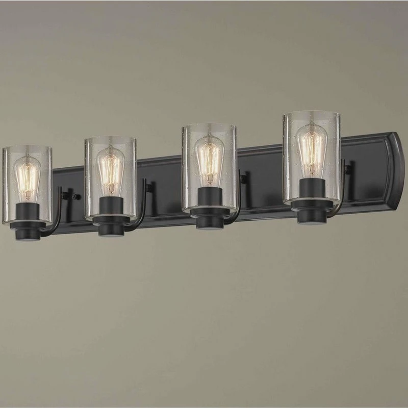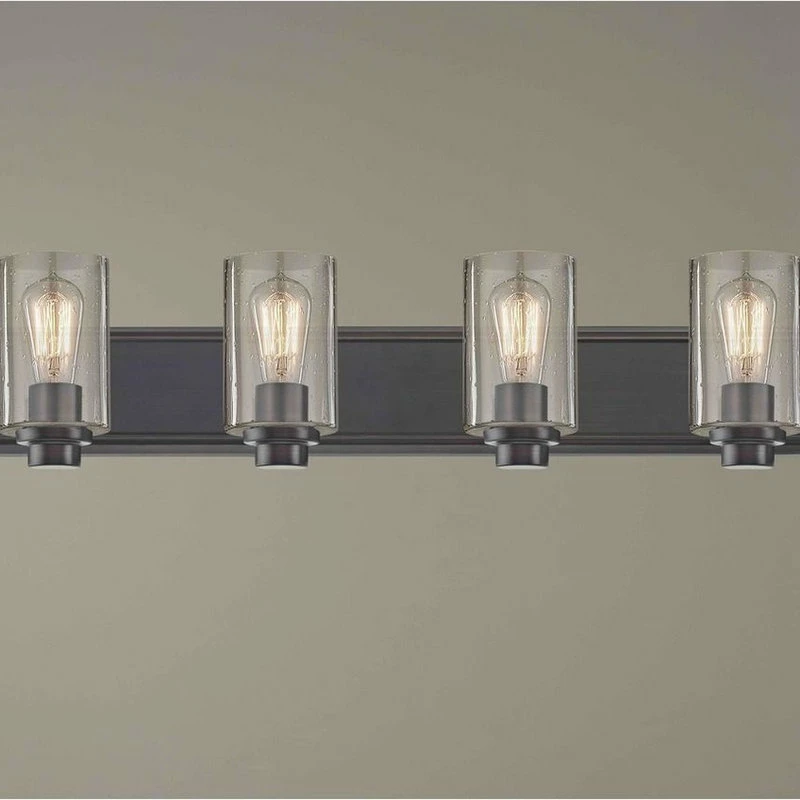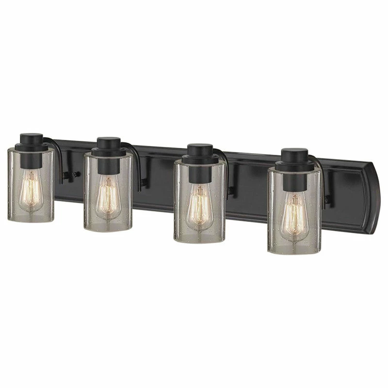 Industrial Seeded Glass Bath Light Bronze 4 Lt Industrial style oil rubbed bronze 4-light bathroom light with cylinder seedy glass. Takes four 60-watt maximum rated medium base ST58 carbon filament light bulbs (not included). Suitable for installation in dry and damp locations. This bathroom light can be mounted with shades facing up or down. 120 line voltage. UL and CUL rated.